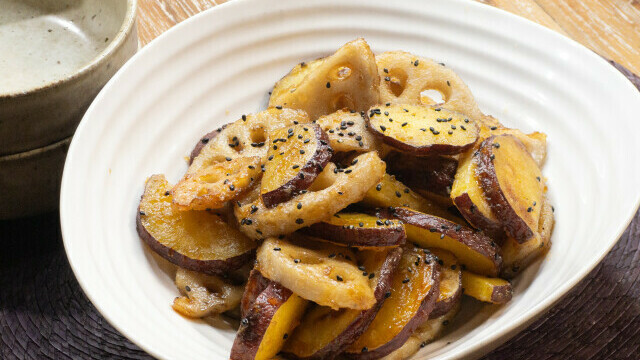 「焼き芋より美味しい食べ方あったわ!」フライパン1つで簡単!さつまいもとれんこんの甘辛炒め