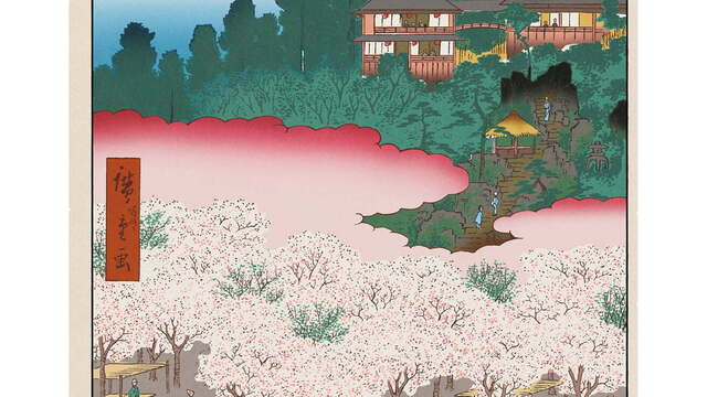 展望風呂から花が咲き乱れる庭園を見下ろす一枚【今日の名所江戸百景 by 村上隆】